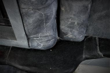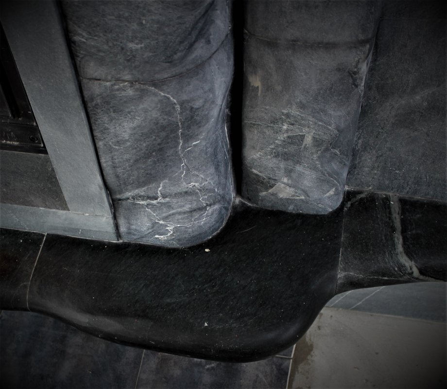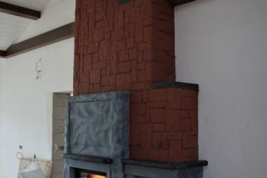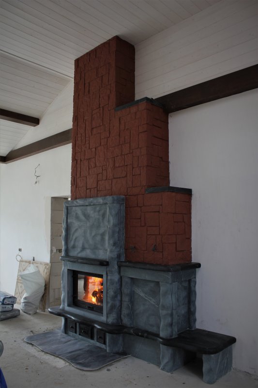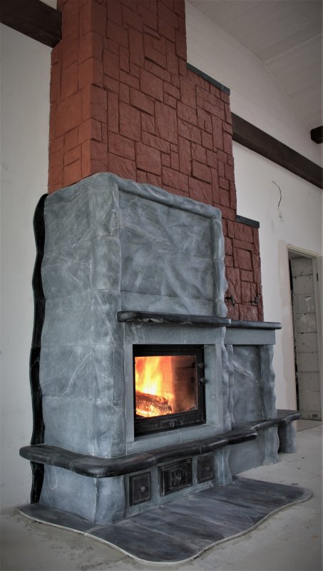 В этот раз серый цвет талькохлорита контрастно разбавлен тёмными полочками, а рядом присоседились теплоёмкая "тумба" и банкетка.