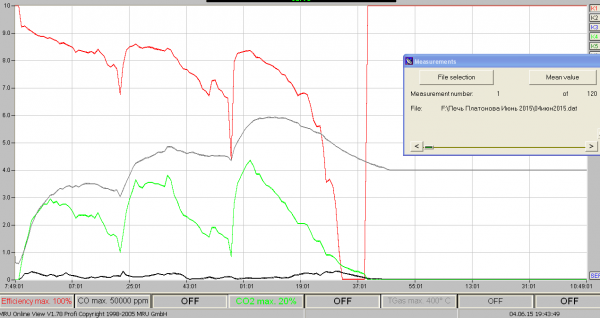 Зонд газоанализатора был установлен на высоте 2,5 м, на коренной трубе непосредственно над местом врезки металлического отвода, соединяющего печь с коренной трубой . Запись показаний газоанализатора фиксировалась в режиме реального времени программой MRU profi, установленной на ноутбуке, подключенном к газоанализатору. Запись показаний заканчивалась при снижении концентрации СО2 в дымовых газах до 25% от максимального значения, полученного в ходе конкретного испытания.