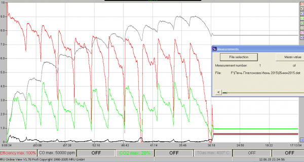 Красным цветом показан график КПД. Видно, что 15 кг дров было сожжено за три раза. При подкладывании следующей порции дров дверка топки открывалась и в печь попадало избыточное количество воздуха – КПД резко падал. После подкладывания свежей порции дров интенсивность горения повышалась и концентрация СО2 в отходящих газах (зеленый график) доходила до своего максимума в данном конкретном опыте. Черным цветом показан график концентрации СО в отходящих газах. Видно, что концентрация СО даже на своем пике не превышает 2000 ррм (0,2%).