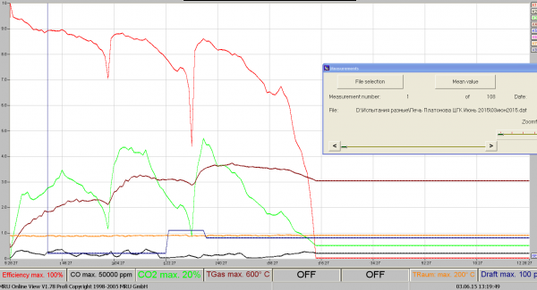 В отличие от испытаний на перетоп, проведенных 05 июня 2015 года, жалюзи на дверце топки не открывались. Это сказалось на увеличении концентрации СО в дымовых газах почти в два раза. Этому увеличению несомненно способствовало и то, что дрова в испытаниях от 13 июня были более сухими, т.е. горели более «дружно» и выделение летучих шло более лавинообразно. В связи с этим преждевременно делать однозначный вывод о влиянии закрытой дверки топки на качество сжигания.