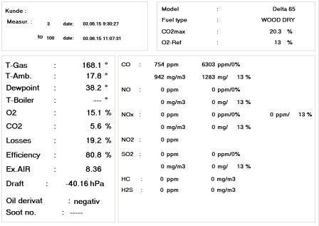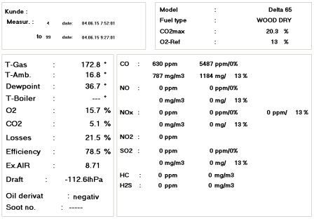 Концентрация СО 942 mg/m3 существенно ниже европейской нормы (1500 mg/m3), что говорит о достаточно полном дожиге топлива. При пересчете на 0% кислорода в дымовых газах концентрация составляет 6303 ppm/0%. (этот показатель позволяет сравнивать процессы при приведении коэффициента избытка воздуха к 1, т.е. сравнивать не разбавленные концентрации ).